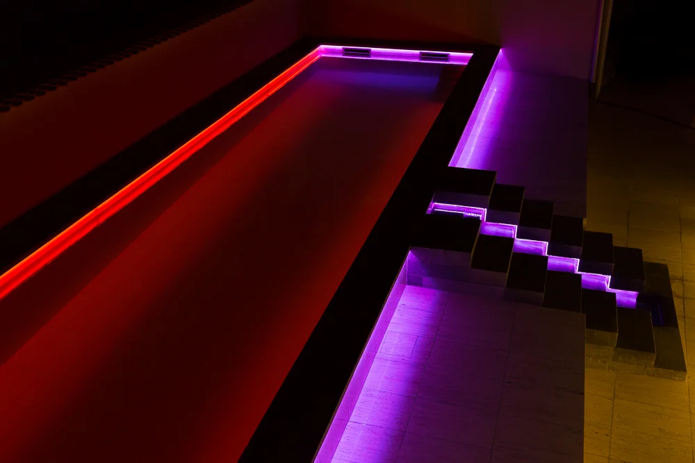 Auf der unteren Gartenebene hat ein langgestreckter Pool mit integriertem Wasserspiel und Palmen Platz gefunden.